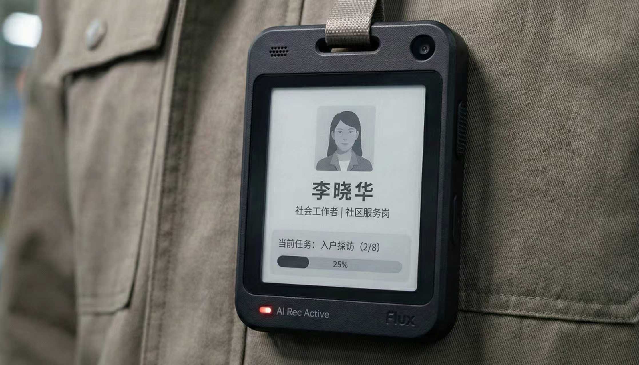 社工在探访独居老人时,不再需要拿着本子或手机记录。FluxBadge 会静默记录谈话重点,分析老人健康状况与需求,让社工能全心全意进行面对面的关怀。